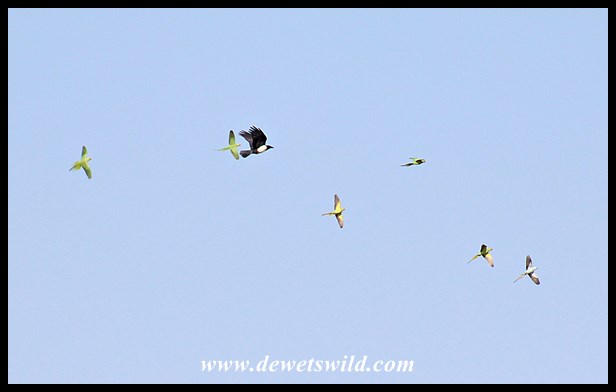 Flock of Rose-ringed Parakeets mobbing a Pied Crow
