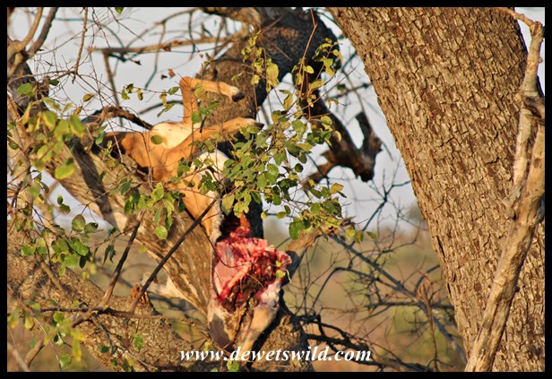The leopard did appear briefly just before we arrived on the scene, AJ. But the huge crowd of cars that had gathered at the sighting soon scared him off again. I’m sure it returned after dark to complete its meal.
