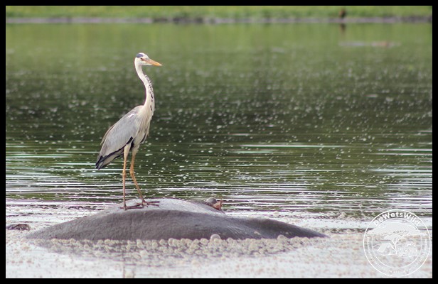Grey Heron using a hippo as an island