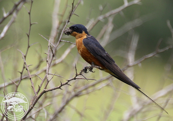 Red-breasted Swallow taking off with mud in its mouth