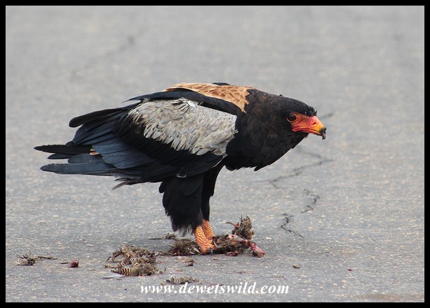 Bateleurs inhabit open habitats, ranging from semi-desert shrublands and grasslands to savannas and open woodlands. They prey on a variety of smaller mammals, birds, reptiles (including venomous snakes), insects and even fish and amphibians, caught from drying pools. They also include a large percentage of carrion in their diet – in fact, they are usually one of the first species to arrive at a carcass. They spend many hours daily on the wing, gliding fast and low over the ground in search of food and covering as much of 400km a day in this way!