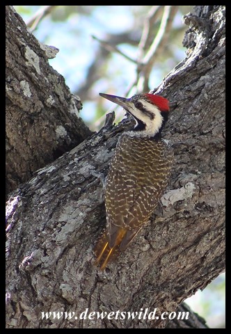 The Bearded Woodpecker inhabits savannas and woodlands with tall trees, where it forages (it rarely descends to ground level) by tapping on branches and probing in crevices and behind bark for insects and spiders and the occasional lizard or gecko.