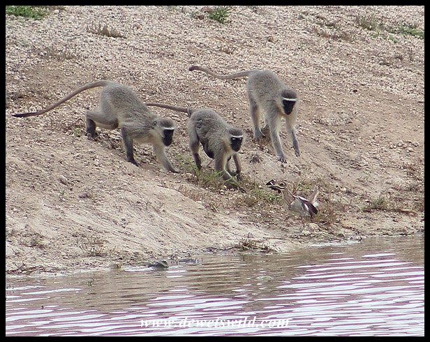 Vervet monkey jumping across the stream feeding into Tlopi’s dam