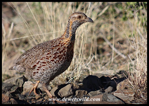 A fairly common inhabitant of fynbos and mountain grasslands and scrub to elevations as high as 2750m above sea level, Grey-winged Francolins move around in groups of up to 25 birds, but more usually between 3 and 8. Insects and bulbous plants make up the majority of its diet. Adults grow to 33cm with a weight of up to 520g.