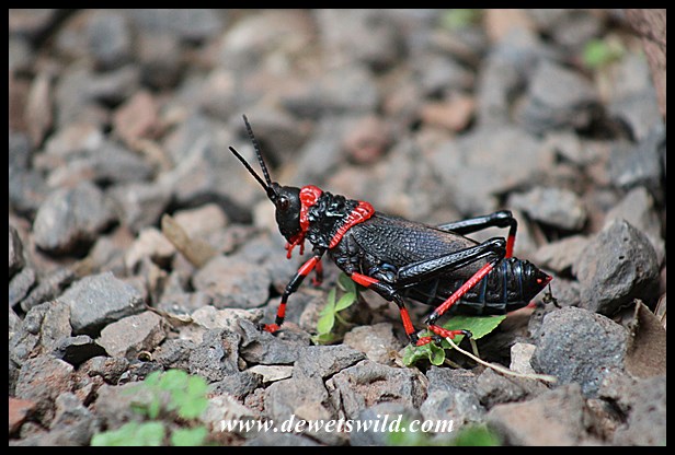 The Koppie Foam Grasshopper is a large (up to 8cm long) insect whose brilliant red-and-black colouration advertises to any would-be predator that it is poisonous enough to kill a dog. This poison is accumulated in the body tissues of the Koppie Foam Grasshopper when it feeds on poisonous plants from the milkweed family and is exuded in the form of a bloody foam when the insect is attacked. Their wings are far too short to permit flying. Koppie Foam Grasshoppers occur over most of South Africa, being absent only from Kwazulu-Natal and the eastern Free State. They live in open, sparsely vegetated and often rocky areas and are regularly encountered on hills (koppies in Afrikaans) and mountain tops.