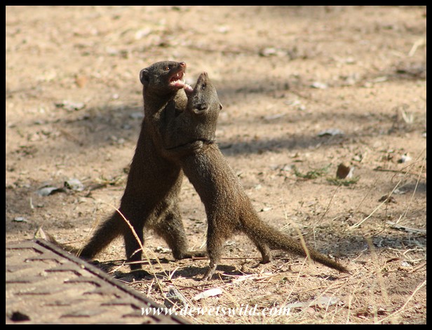Dwarf Mongooses live in close-knit clans, but that doesn’t mean there isn’t the occasional squabble between family members! While walking around Pretoriuskop Rest Camp on a recent visit to the south of the Kruger National Park, I spied two of the tiny tykes continuously working on each other’s nerves, until eventually and inevitably the fight escalated into blows.