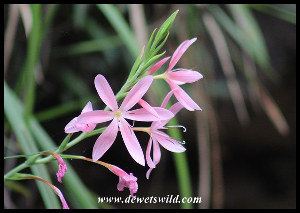 The River Lily is a much-loved plant in gardens the world over, but it grows wild here in saturated soil along the mountain streams of South Africa’s Drakensberg Range. These bulbous plants stand about 50cm high, grow and flower in full sun during summer with the beautiful blooms being carried from December to April. Apart from the pink form shown here there’s also white and bright red varieties growing wild, while cultivated forms with much wider petals than the wild forms are normally sold at nurseries. The flowers are pollinated by butterflies and flies, and the whole plant goes dormant in winter.