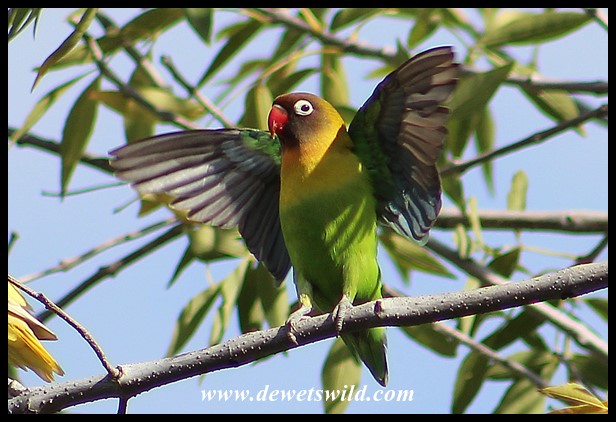Africa and Madagascar is home to nine species of Lovebird – a family of small parrots – but only one, the Rosy-faced Lovebird, occurs naturally in South Africa;  in a tiny corner of the Northern Cape along the border with Namibia. Lovebirds are very popular in the pet trade, and it is probably due to escapees that feral populations of Lovebirds have become established in Pretoria and a few other locations in South Africa. Many of the Lovebirds now flying wild around our suburb have features in common with the Rosy-faced, Black-cheeked, Fischer’sLilian’s and Yellow-collared Lovebirds, but they are probably all hybrids of these and other kinds.