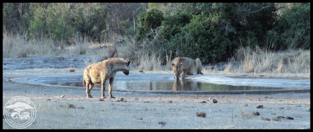 On the afternoon of our arrival at Skukuza, and after taking a quick detour to collect Hannes’ vehicle from the Skukuza airport where a fire was raging, Irving got a report of a leopard on a kill at De La Porte Waterhole just a few kilometres to the south of camp. When we got there however the leopard had been chased off its prey by a lioness and hyena, who by this time was having a stare-off at the waterhole. A second lioness appeared and the two then headed to a nearby koppie, crossing the road very near to our vehicle.