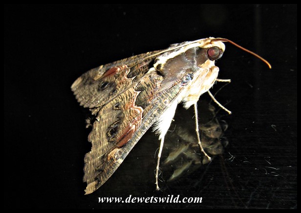 As with the English common name, one of the Sundowner Moth’s Afrikaans names, “Biermot” (Beer moth), refers to their attraction to alcoholic drinks – they’re naturally very fond of fermented fruit. Due to their habit of piercing fruit, it is considered a pest in orchards. They occur over most of South Africa, with the exception of the fynbos -areas in the Western Cape and the arid West Coast, and is especially common in forest and savanna habitats. This is a large moth, with a wingspan of between 6 and 8cm. The larvae feed on the leaves of a very wide range of plants.