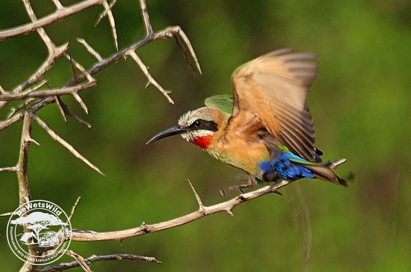 White-fronted Bee-eaters inhabit wooded grasslands and savannas, mostly near large rivers or other reliable water bodies, where they feed mainly on flying insects caught on the wing – most notably honey bees, which make up about ¾ of their diet. They weigh between 30 and 40g.