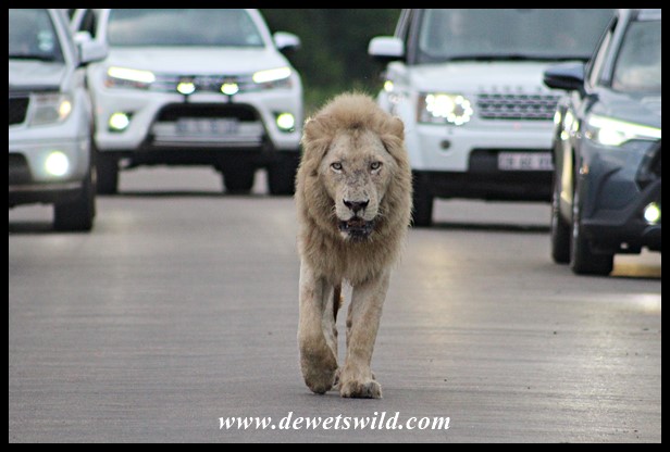 Again we slowly patrol up and down the same stretch of the road, hoping that the White Lion will also pop out of the bush like the ghost he’s named after. After 15 minutes he’s still not appeared and we start believing that he must have been in front of his brothers, and might actually already be on the road to Orpen in which direction we last saw his brothers headed. So we go around the corner, drive 2 or 3 km along the H7 road, but come out empty-handed again, and turn around to go scour the area around the Nwanetsi Bridge again. You would not believe the excitement in our car when we come around the turn to see the White Lion heading straight toward us, entourage in tow, exactly half-an-hour after we last had eyes on his brothers. Since we saw Satara’s White Lion two years ago, he has grown into a very impressive specimen. The oldest and largest of only three known wild White Lions in the world – all of them living in the Kruger National Park – and here he is walking just inches away from our vehicle. We reverse to stay alongside him as he strides down the road, and then let him pass when vehicles start arriving behind us. We couldn’t have asked for a better start to 2022…