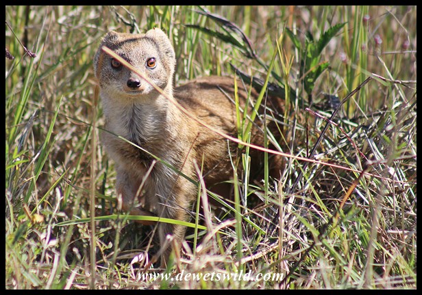 The lithe little Yellow Mongoose can grow to lengths of up to 75cm, and adults weigh from 440 to 900g. They inhabit a wide variety of open habitats, from semi-desert scrub to grasslands and savannas. They are independent of drinking water, and feed mainly on insects, other invertebrates, rodents, small birds and reptiles and frogs, and occasionally carrion and fruit. They have been known to raid chicken runs.